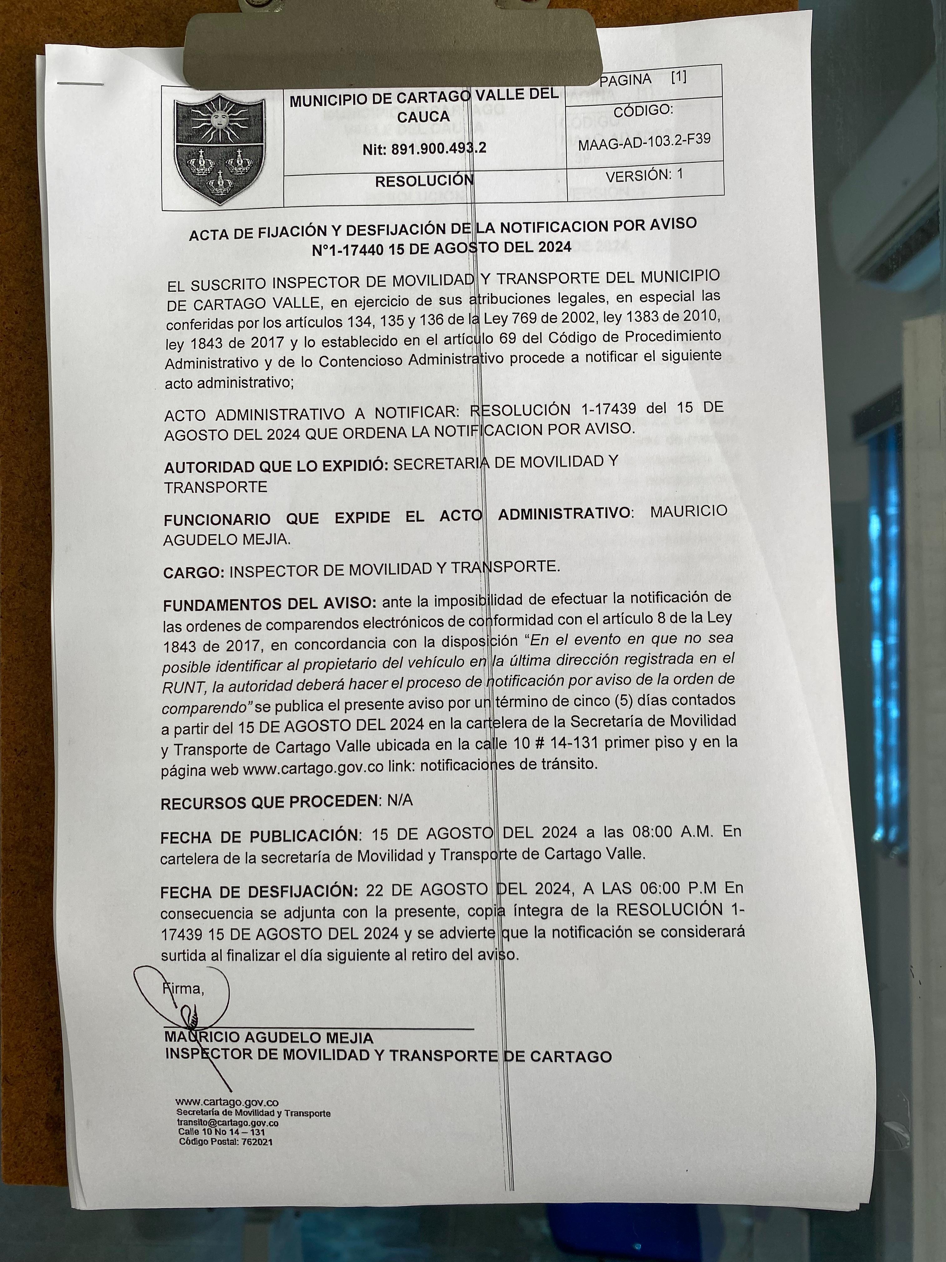 RESOLUCION No. 1-17439 DEL 15 DE AGOSTO DEL 2024 QUE ORDENA LA NOTIFICACION POR AVISO