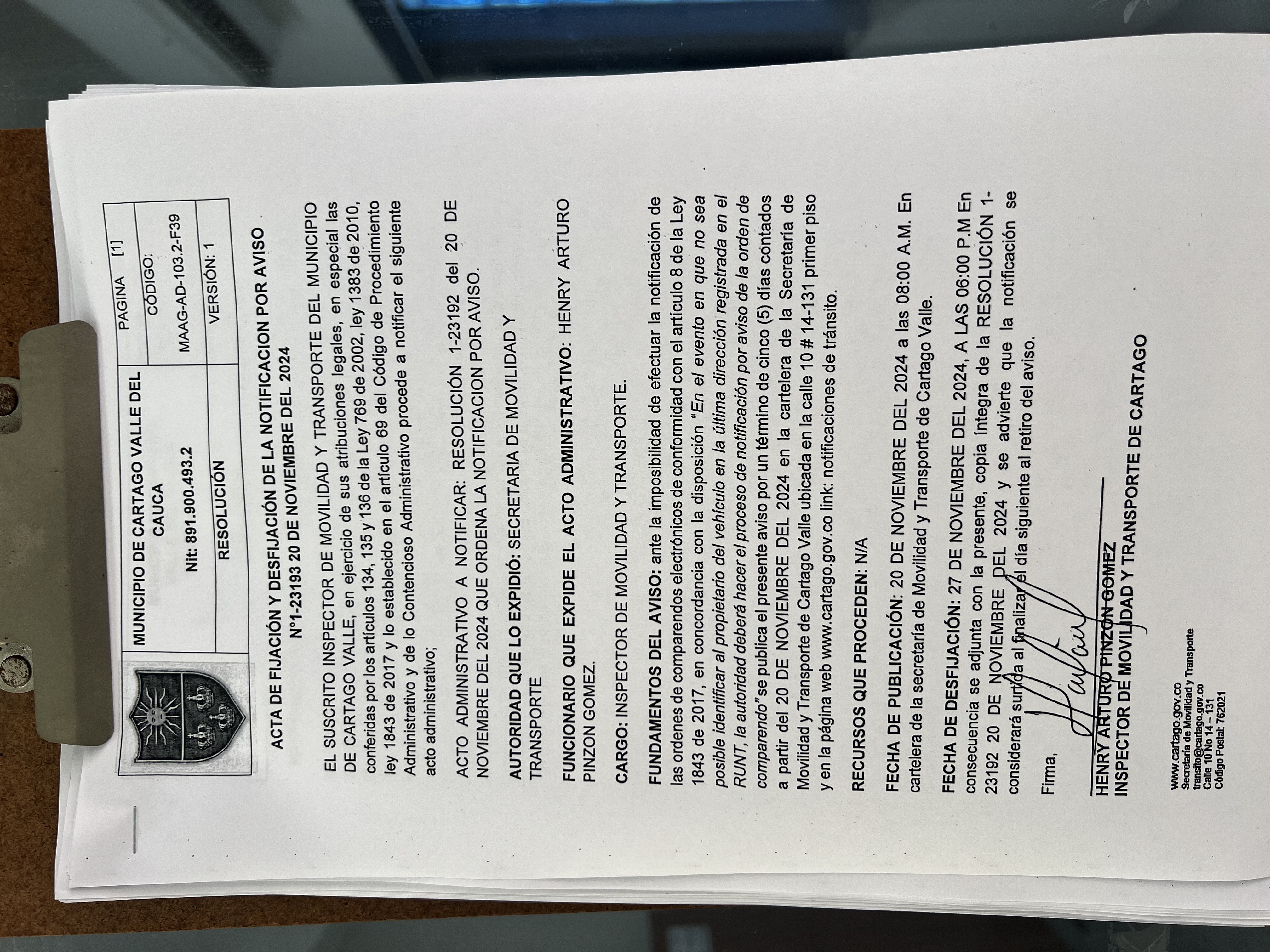 RESOLUCION No. 1-23192 DEL 20 DE NOVIEMBRE DEL 2024 QUE ORDENA LA NOTIFICACION POR AVISO