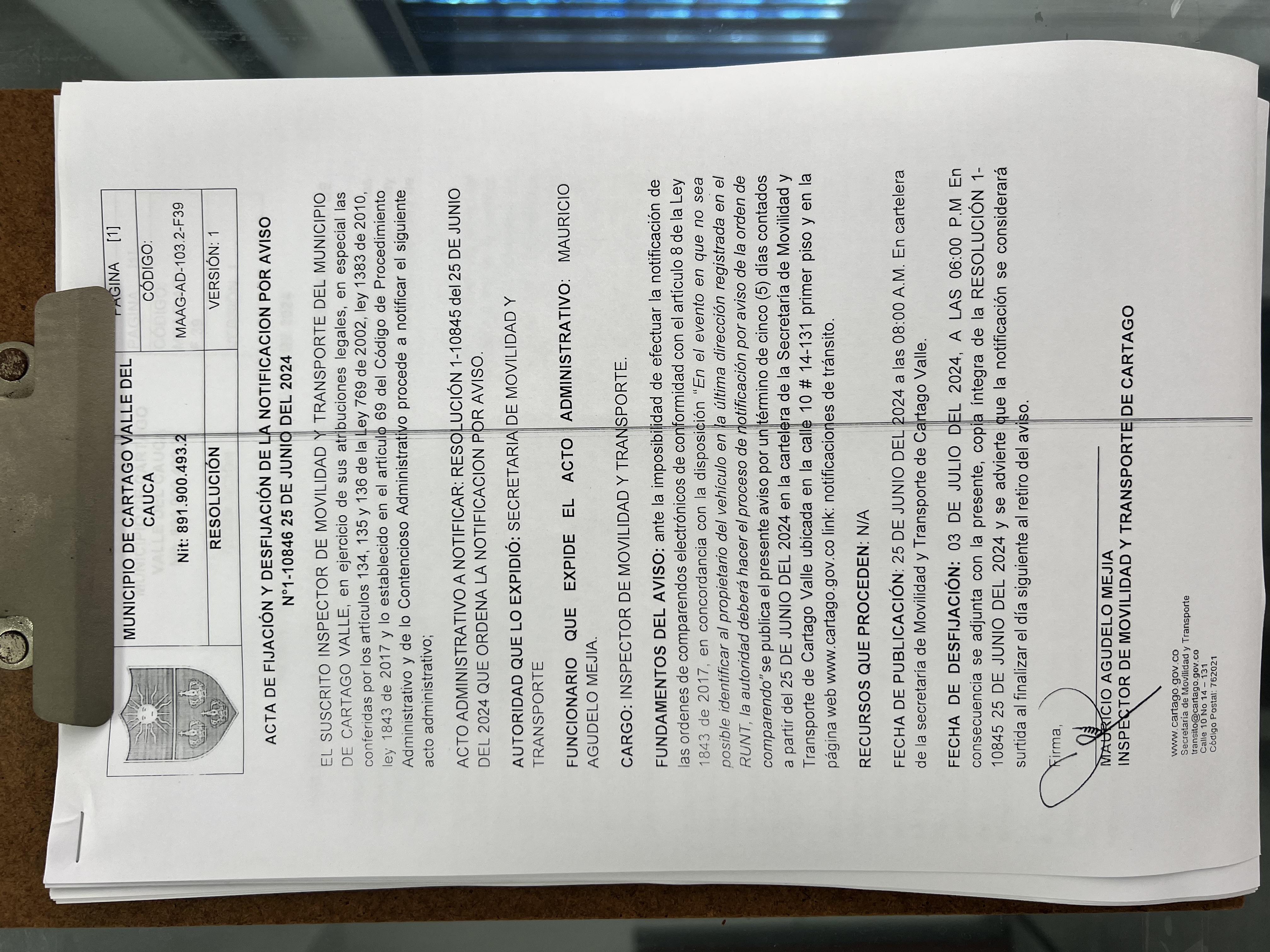RESOLUCION No. 1-10845 DEL 25 DE JUNIO DEL 2024 QUE ORDENA LA NOTIFICACION POR AVISO