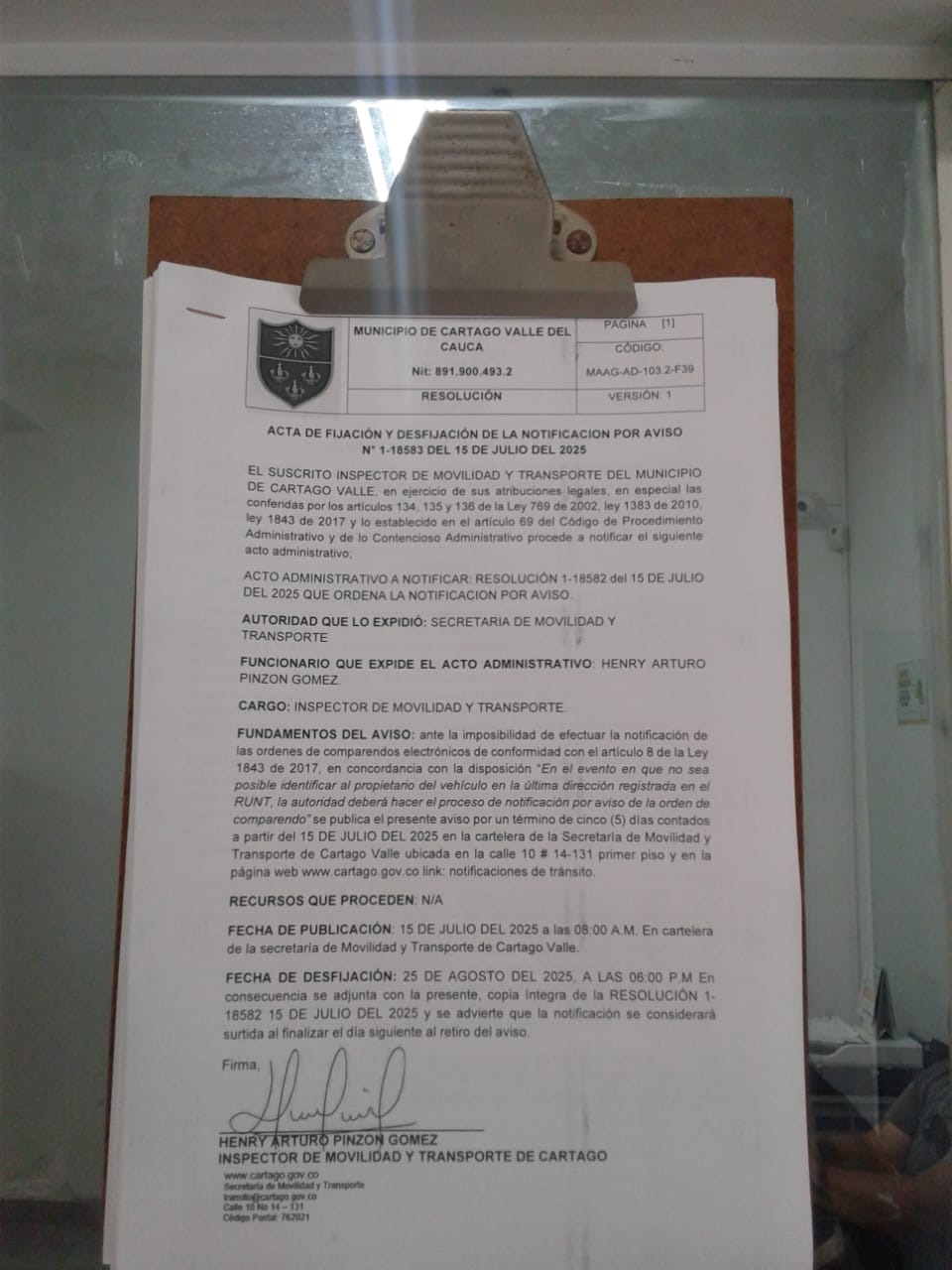 RESOLUCION No. 1-18582 DEL 15 DE AGOSTO DEL 2025 QUE ORDENA LA NOTIFICACION POR AVISO