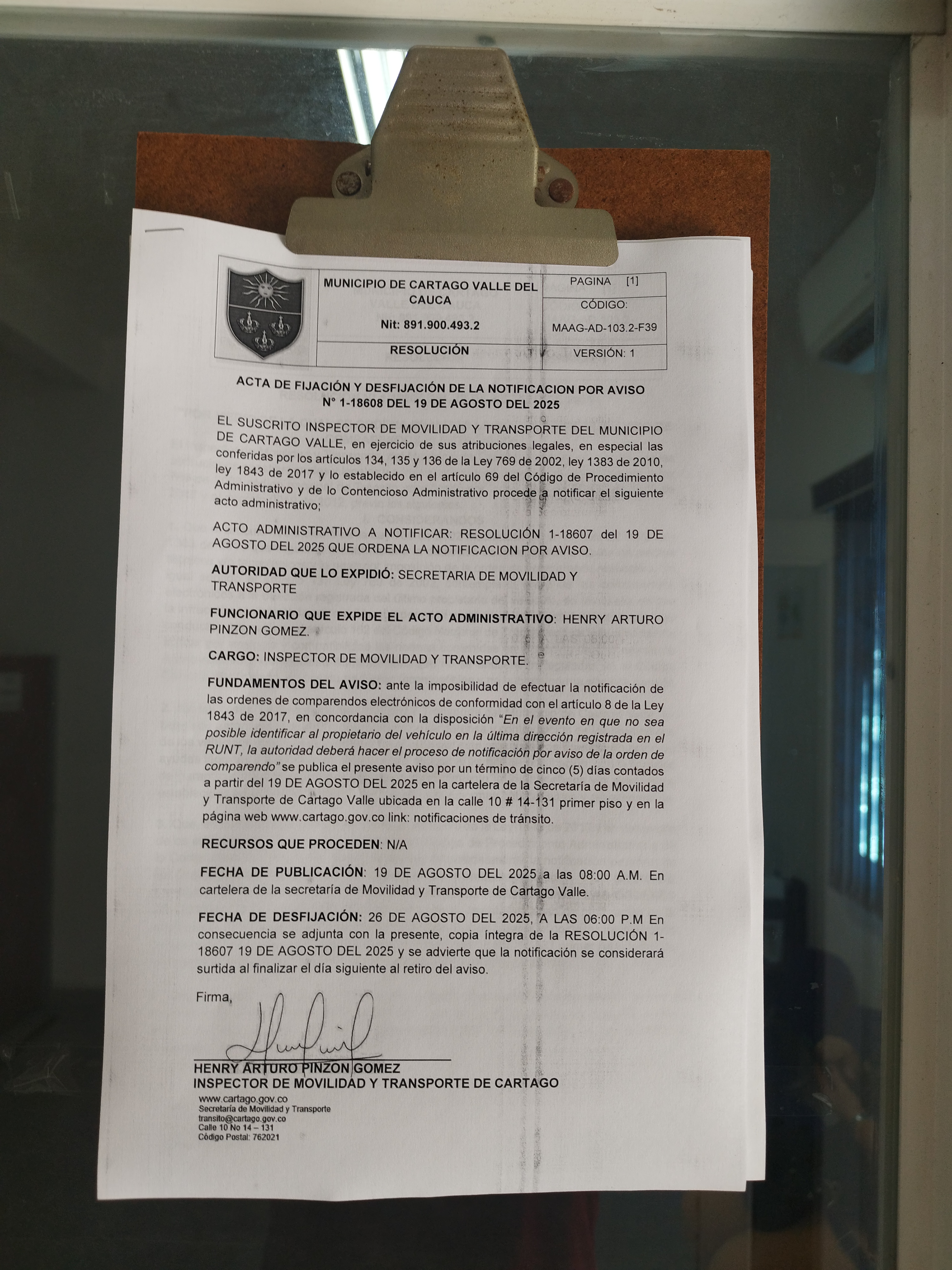 RESOLUCION No. 1-18607 DEL 19 DE AGOSTO DEL 2025 QUE ORDENA LA NOTIFICACION POR AVISO