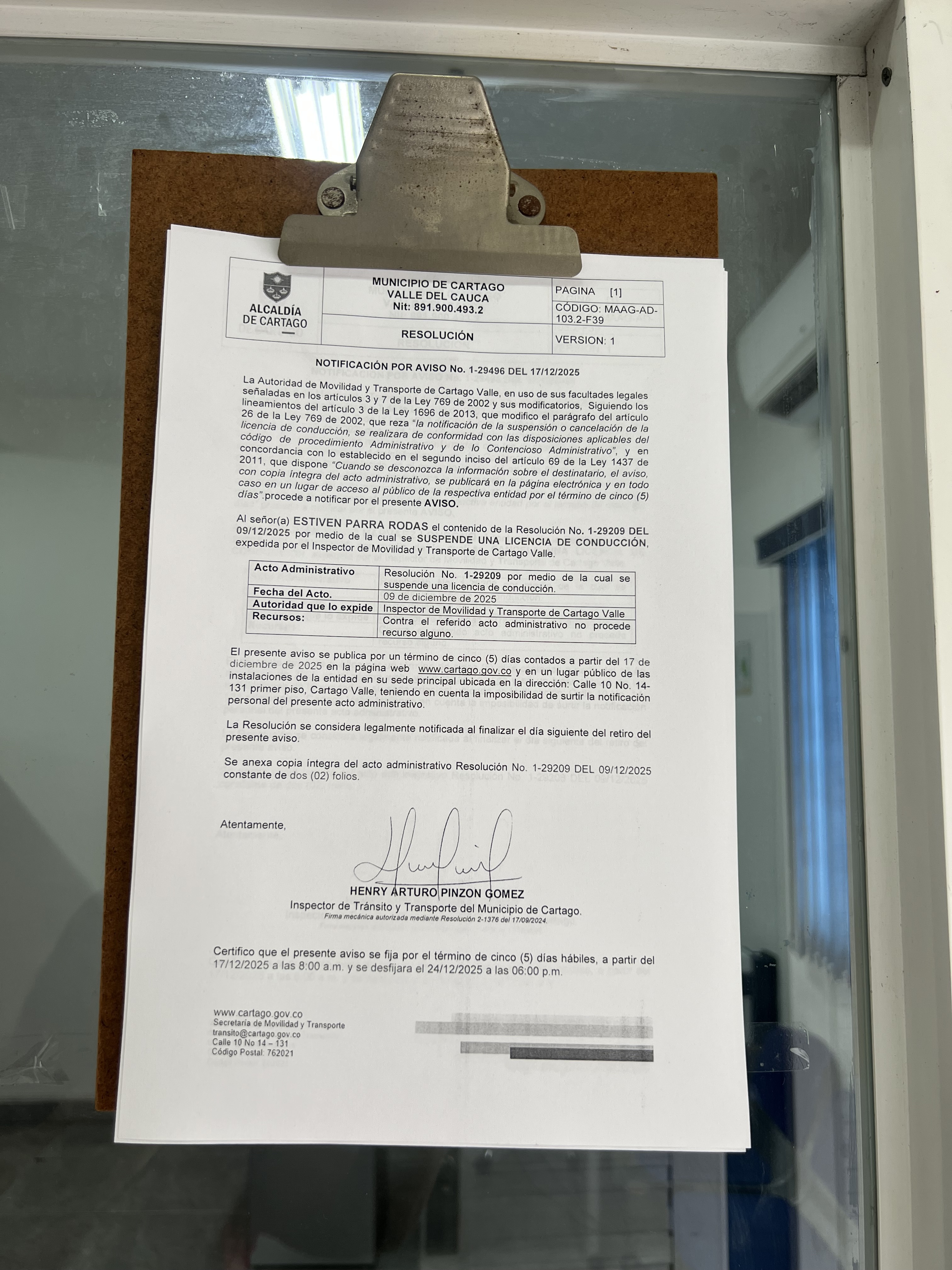 NOTIFICACIÓN POR AVISO - SUSPENSIÓN LICENCIA DE CONDUCCIÓN - ESTIVEN PARRA RODAS