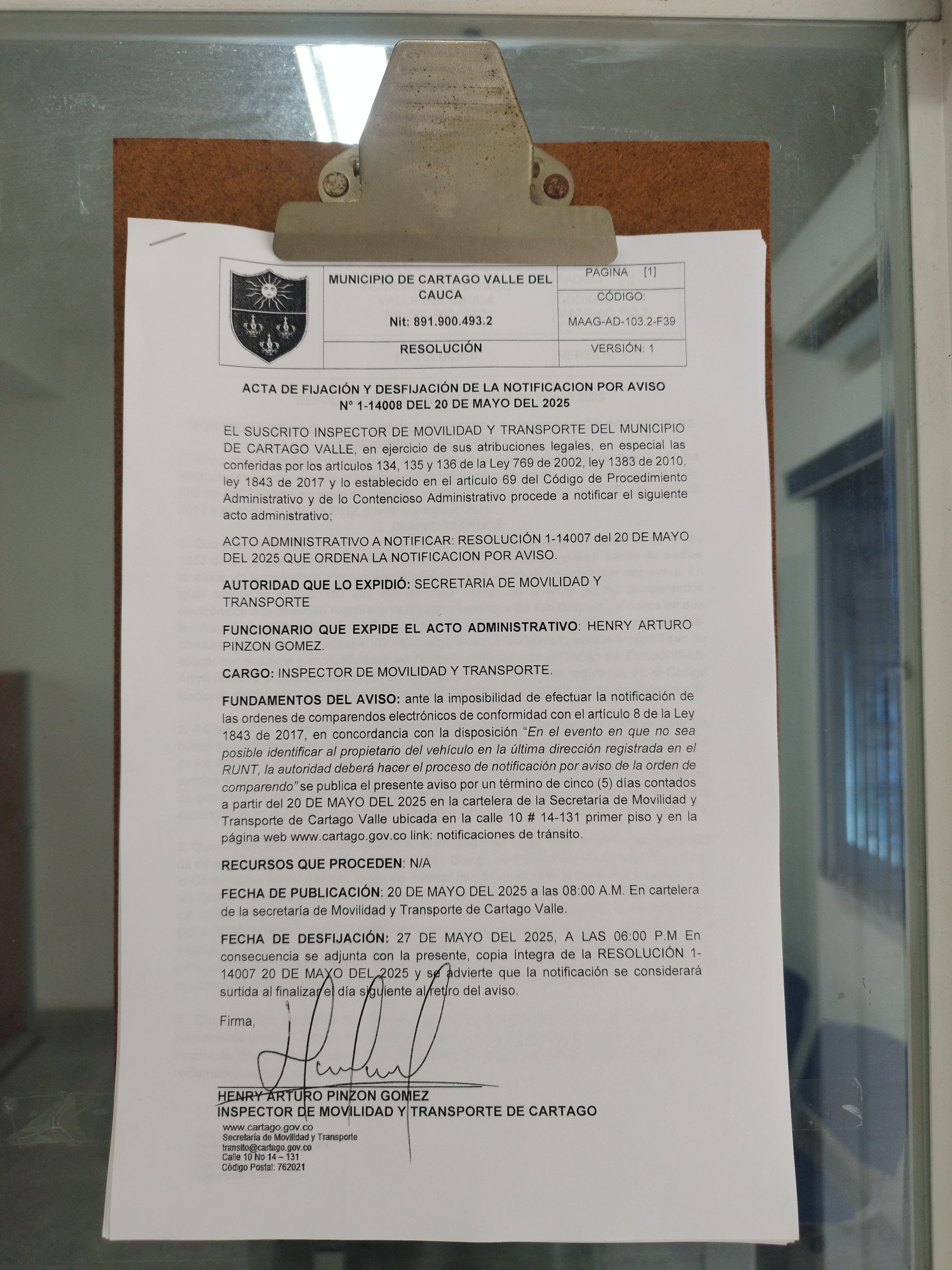 RESOLUCION No. 1-14007 DEL 20 DE MAYO DEL 2025 QUE ORDENA LA NOTIFICACION POR AVISO