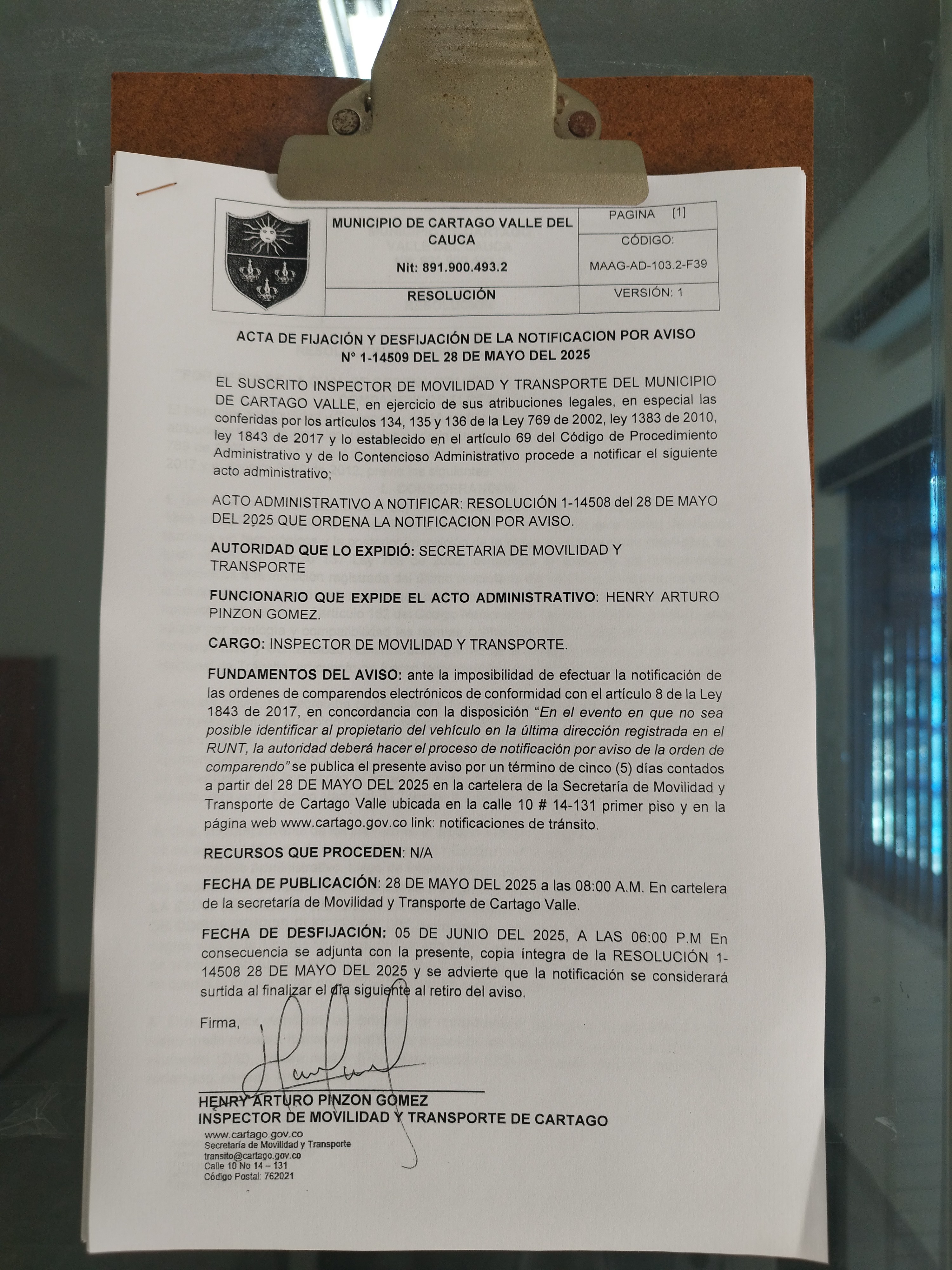 RESOLUCION No. 1-14508 DEL 28 DE MAYO DEL 2025 QUE ORDENA LA NOTIFICACION POR AVISO
