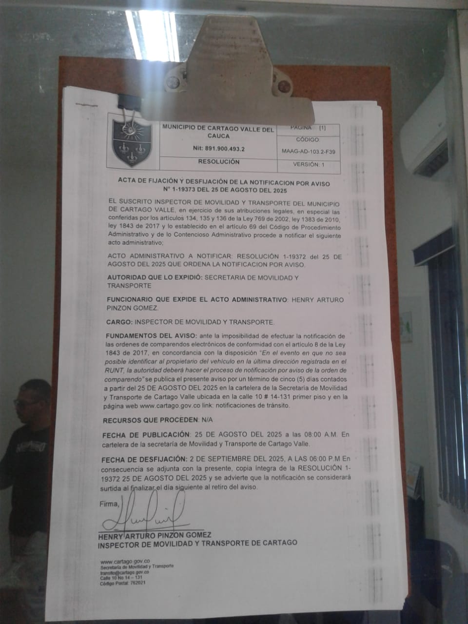 RESOLUCION No. 1-19372 DEL 25 DE AGOSTO DEL 2025 QUE ORDENA LA NOTIFICACION POR AVISO