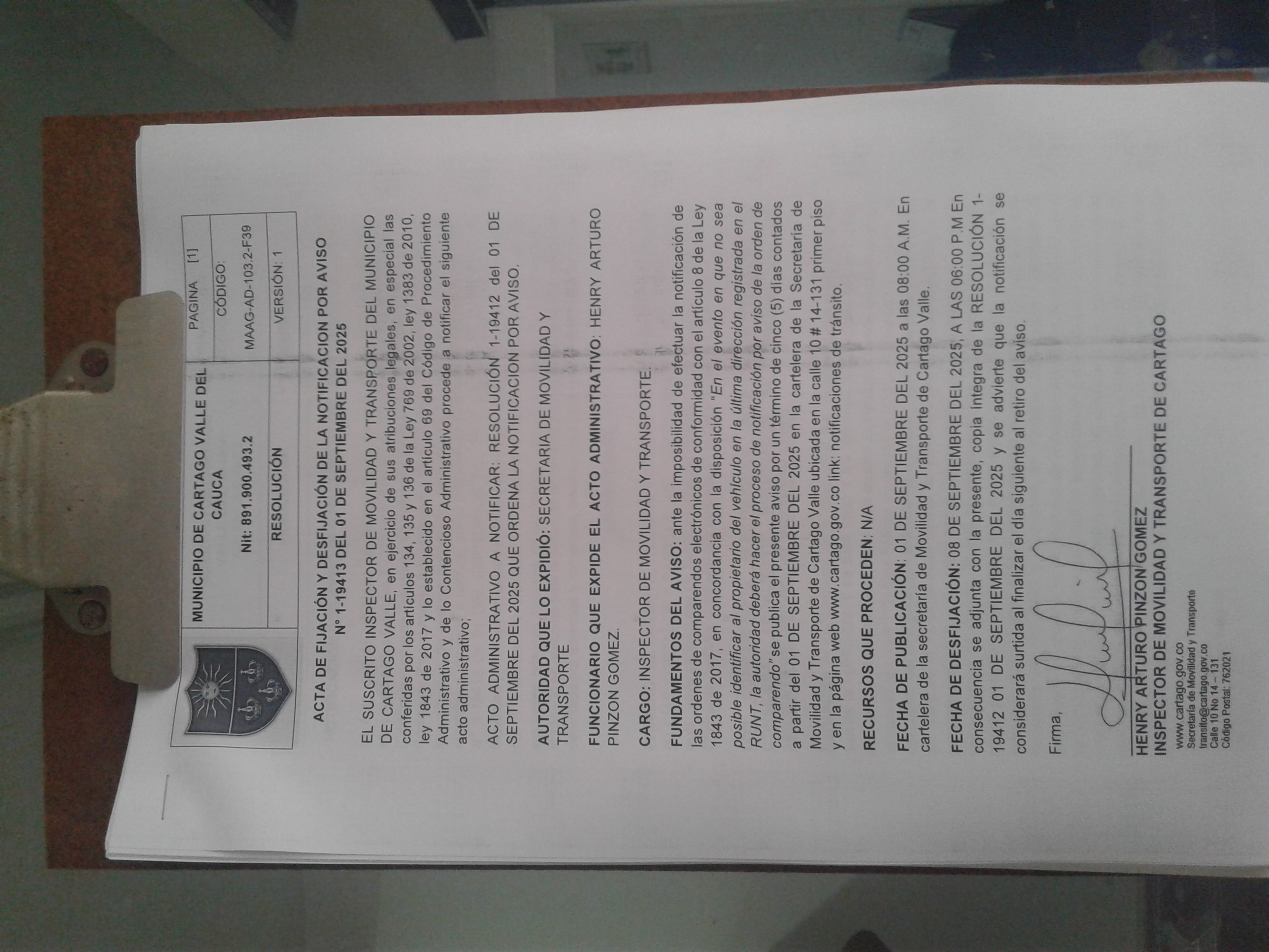 RESOLUCION No. 1-19412 DEL 01 DE SEPTIEMBRE DEL 2025 QUE ORDENA LA NOTIFICACION POR AVISO